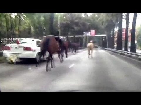 يظهر هذا الفيدو الذي صوره أحد راكبي السيارات في أحد أشد شوارع العاصمة المكسيكية سيتي إزدحاما تدافع 30 حصانا تابعا